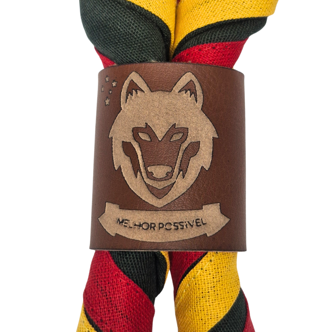 Arganel de couro sintético, fechado com arrebite de ouro envelhecido, estrutura gráfica em corte a laser.