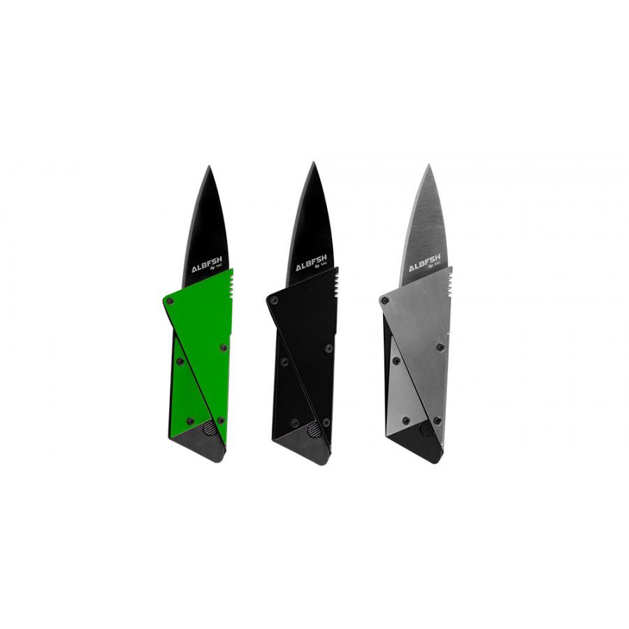 Cartão Canivete Albatroz, com a presença de lâminas de metais em seu corpo de polímero. Esse equipamento torna-se mais resistente, sem perder a sua particularidade podendo guardá-lo de forma discreta em sua carteira ou bolso.