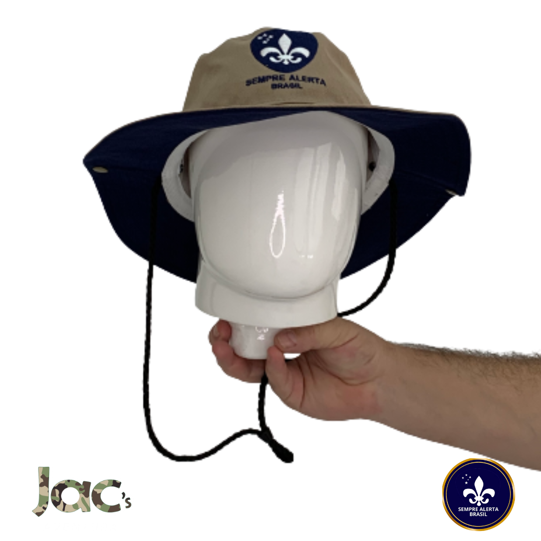 Possuí uma cordinha para regulagem na cabeça e dois botões laterais para prender as laterais do chapéu.